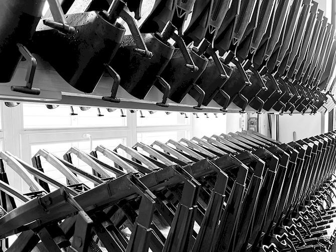 Rám vstupuje do automatizované lakovací linky, kde dostane finální povrch (barva, lak, značka). Od surového průmyslového vzhledu až po prémiové lakování: mokré nebo práškové.