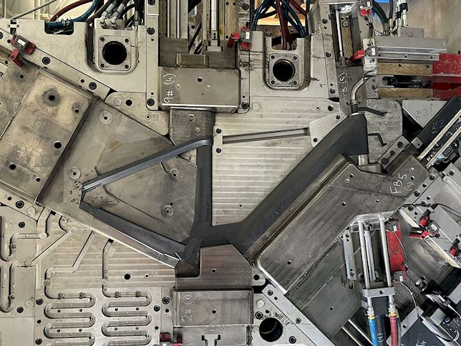 Forma se ochladí, aby materiál ztuhl. Po otevření je hotový díl vyjmut – obvykle robotem. Kompletní výrobní cyklus: cca 2 minuty.